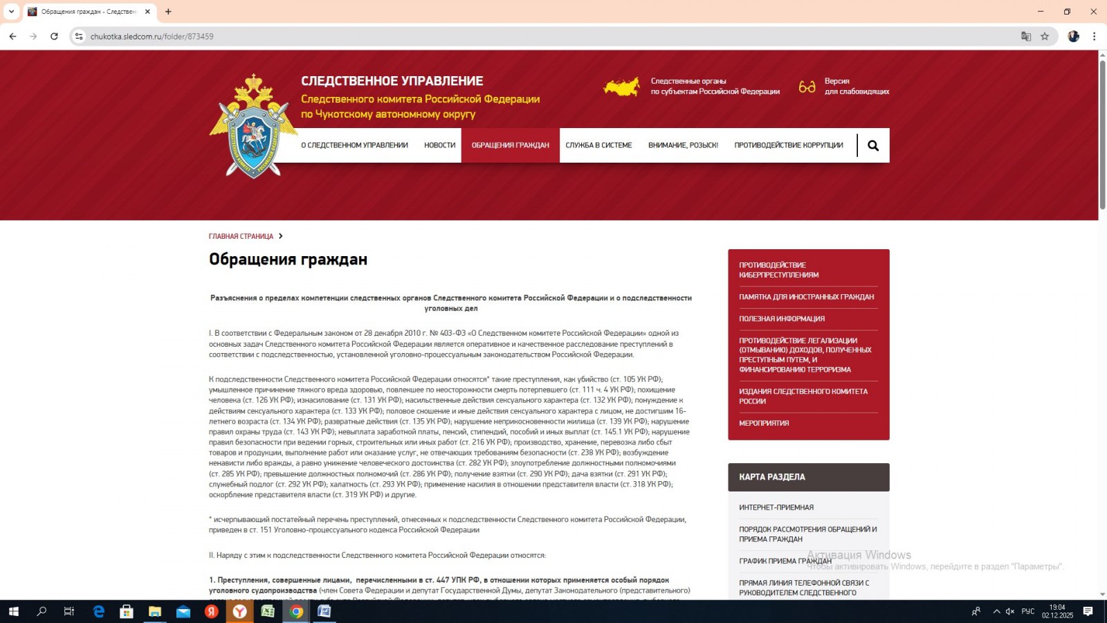 В целях обеспечения возможности обращения граждан в органы Следственного комитета Российской Федерации на официальном сайте следственного управления СК России по Чукотскому автономному округу в круглосуточном режиме работает интернет-приемная.