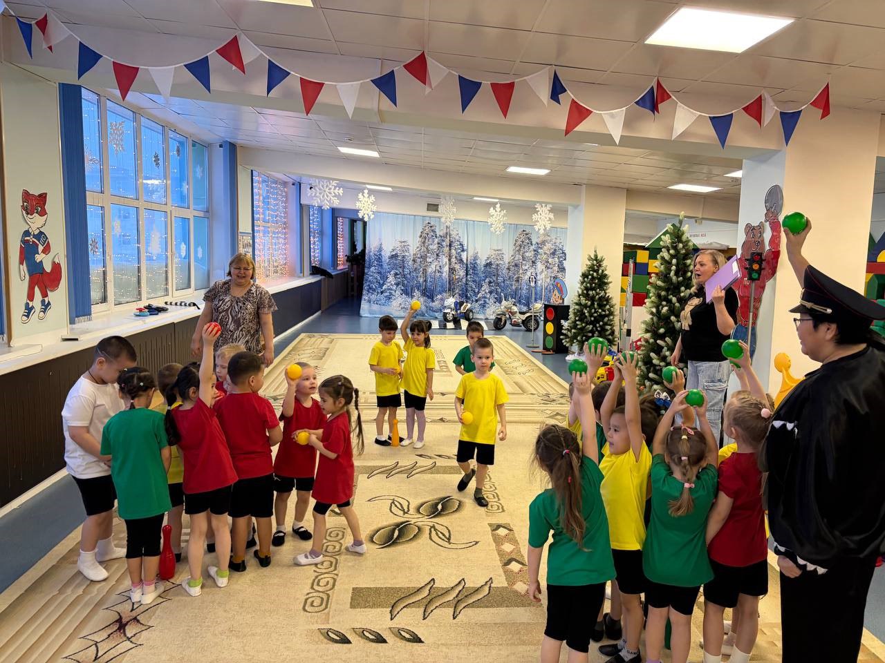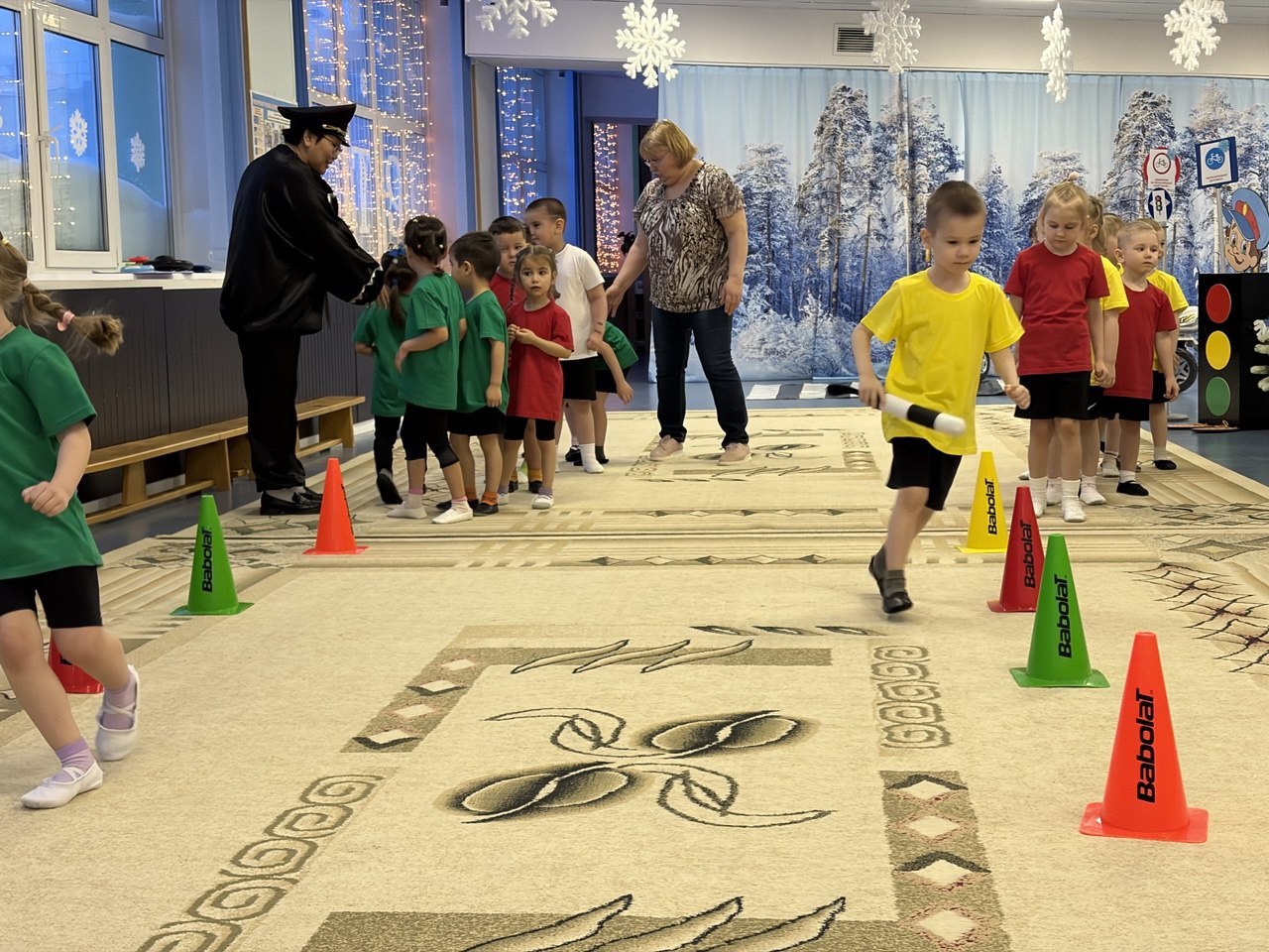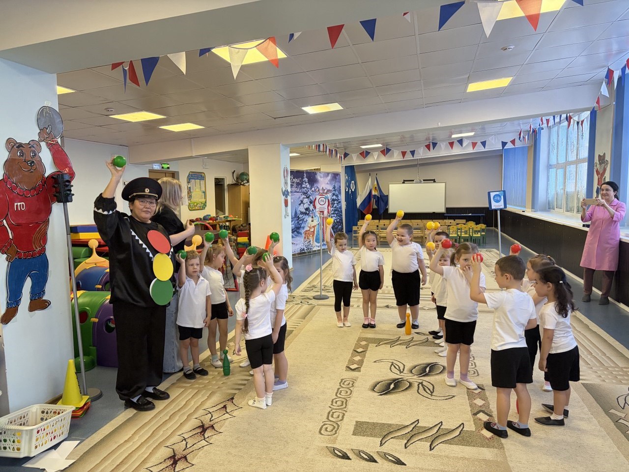 Ребята активно участвовали в разнообразных заданиях: повторяли значения сигналов светофора, соревновались в эстафете с жезлом регулировщика, играли в «Соберись у светофора!» с цветными шариками, а также собирали модель пешеходного перехода в творческом задании.