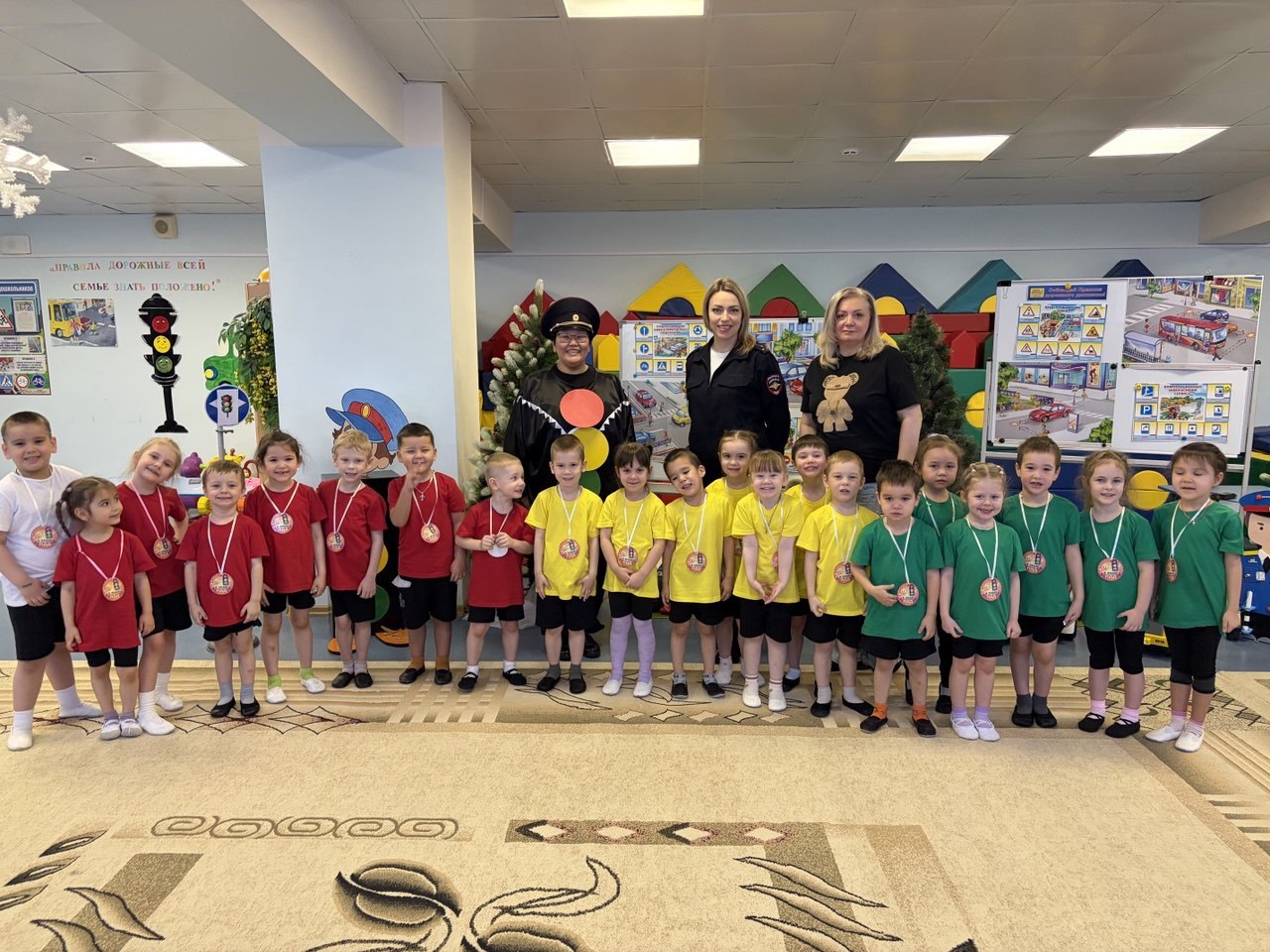 В завершение инспектор напомнила детям о ключевых правилах: обязательном соблюдении ПДД, безопасном переходе проезжей части и необходимости крепко держать родителей за руку при переходе дороги. Каждый участник получил тематическую медаль «Знаток ПДД» за активность и отличные знания.