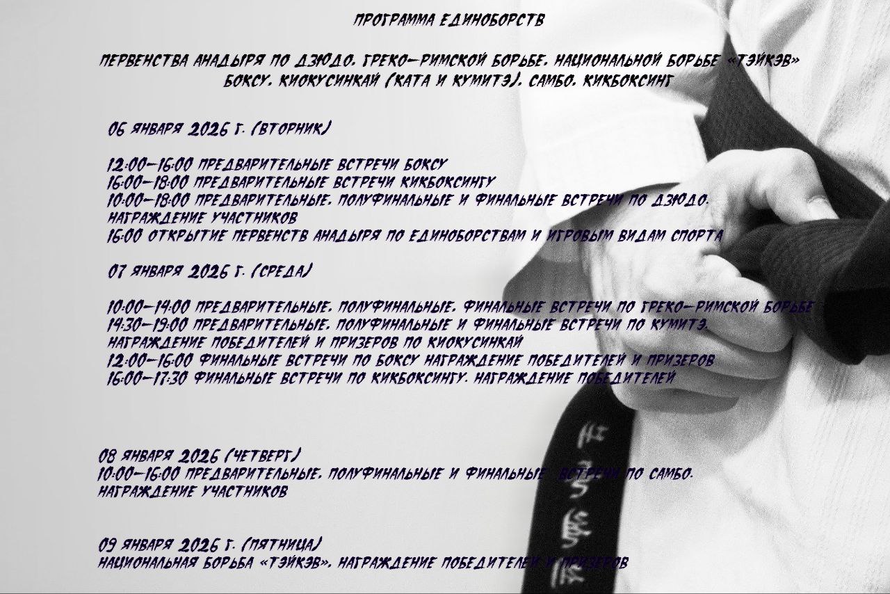 С 4 по 10 января в нашем городе пройдет Первенство по единоборствам и игровым видам спорта! Это уникальная возможность для всех жителей Анадыря активно провести время, поддержать своих спортсменов и стать частью настоящего спортивного праздника!