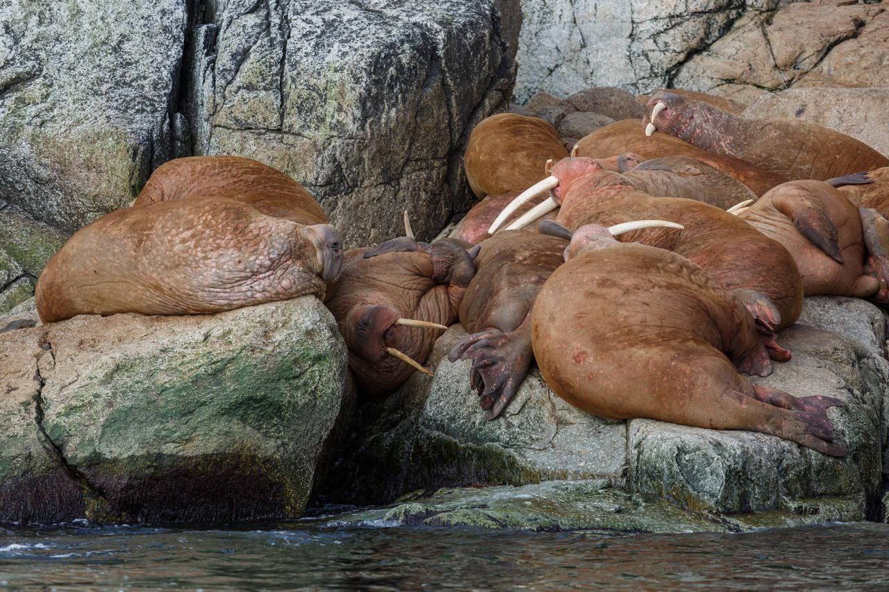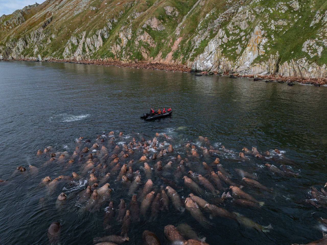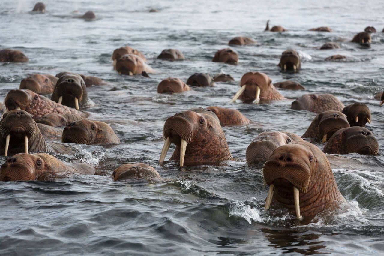 Большая группа моржей, обитающих возле острова Ратманова в Чукотском автономном округе, была замечена очень близко