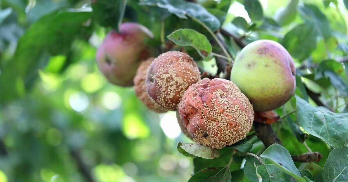 - Поражение плодов: На фруктовых культурах, таких как яблоки, груши и сливи, появляются характерные бурые пятна. Эти пятна очень быстро увеличиваются и охватывают всю поверхность плодов.