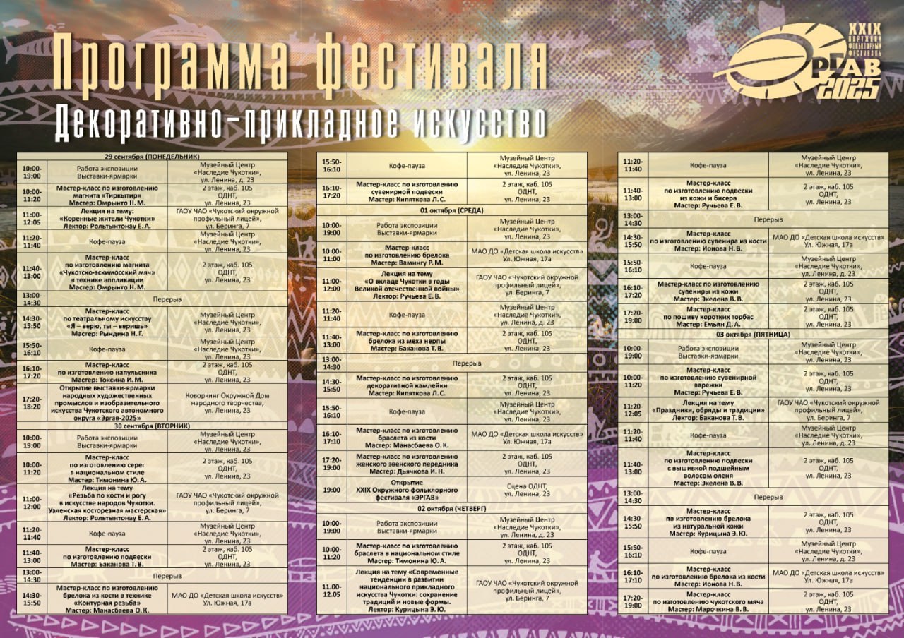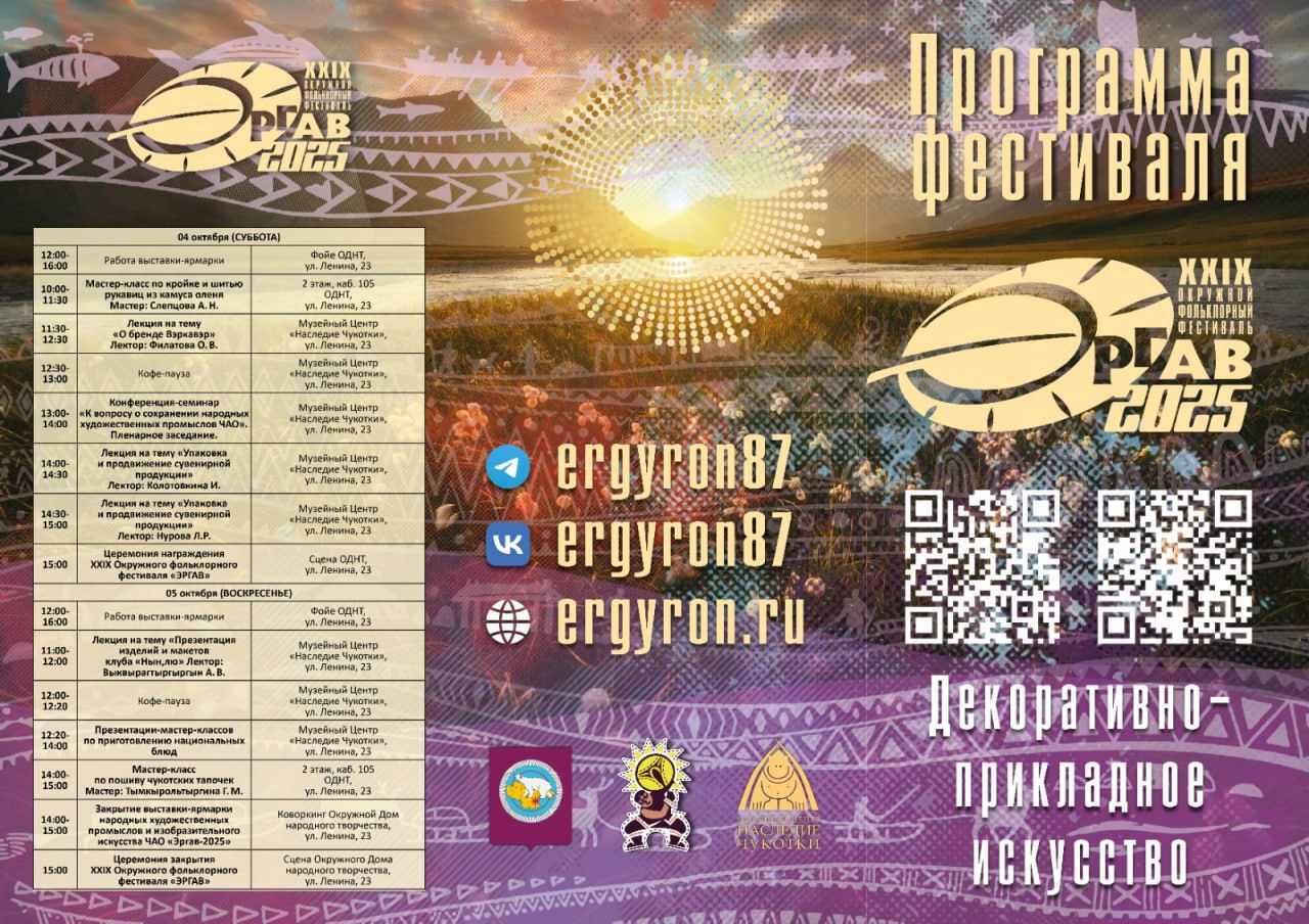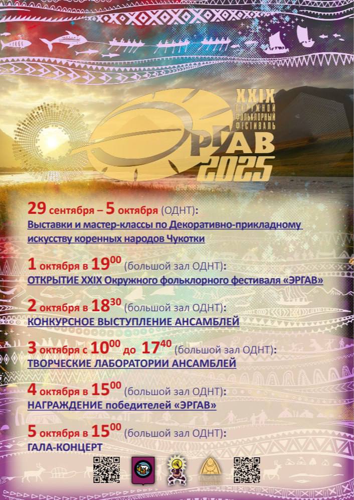 Фестиваль «Эргав — 2025» проходит в Анадыре с 29 сентября по 5 октября. Все желающие могут принять участие в мастер-классах и лекциях, посвящённых традиционным танцам, технологией создания сувениров и украшений из кости и меха нерпы, сувенирных варежек, коротких торбасов и подвесок из шейного волоса оленя. Требуется предварительная регистрация.