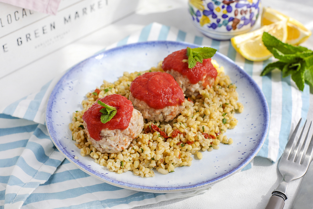 Шаг 3: Вяленые томаты нарежьте мелким кубиком, а свежие травы (мяту, петрушку и кинзу) мелко порубите. Смешайте эти ингредиенты с готовым булгуром. Подавайте митболы из кролика с ароматным томатным соусом сразу же, чтобы насладиться их неповторимым вкусом.