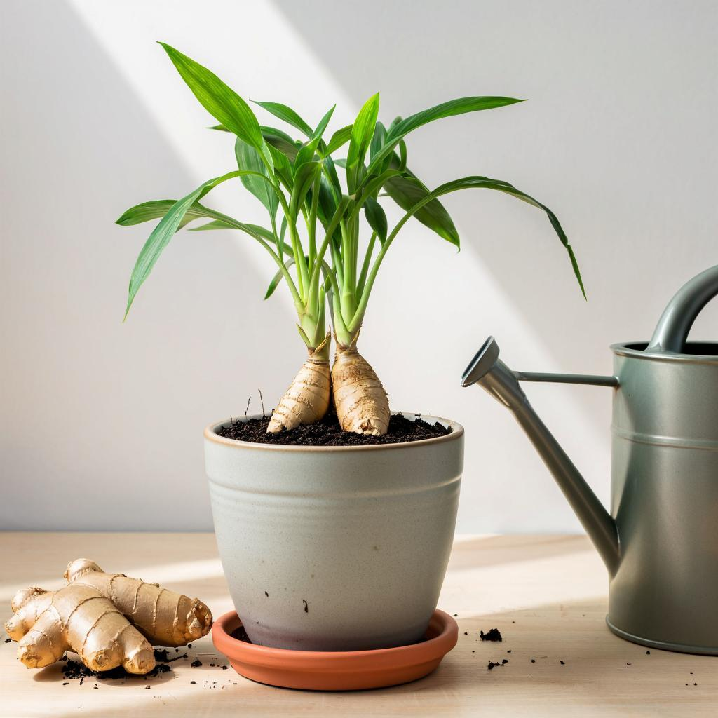 С появлением первых крепких ростков, которые напоминают свернутые листья, горшок можно перенести на светлое место — идеально подойдет восточное или западное окно с рассеянным светом. Имбирь предпочитает температуру 22-25 градусов и высокую влажность, поэтому регулярные опрыскивания только приветствуются.