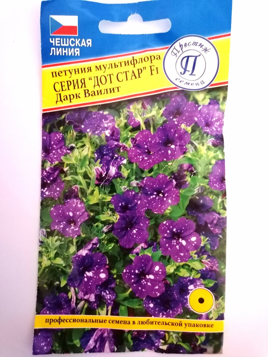 Петуния «Дот Стар» Дарк Ваилит — это семенной аналог знаменитого Блю Скай. Хотя по количеству белых вкраплений он не дотягивает до своего вегетативного собрата, его необычный вид способен восхитить. Эта петуния достигает в высоту около 35 см, обильно цветет и быстро восстанавливается после неблагоприятных погодных условий, таких как дожди или град.