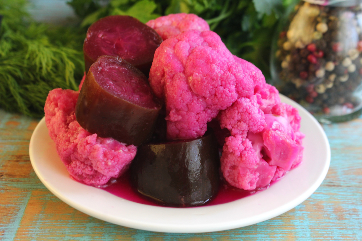 Для начала овощи берут свежие и качественные. Цветную капусту разделяют на соцветия, огурцы нарезают крупными кружочками, а свеклу чистят и нарезают произвольно. Все ингредиенты помещают в удобную посуду с крышкой, перемешивая их для равномерного распределения.