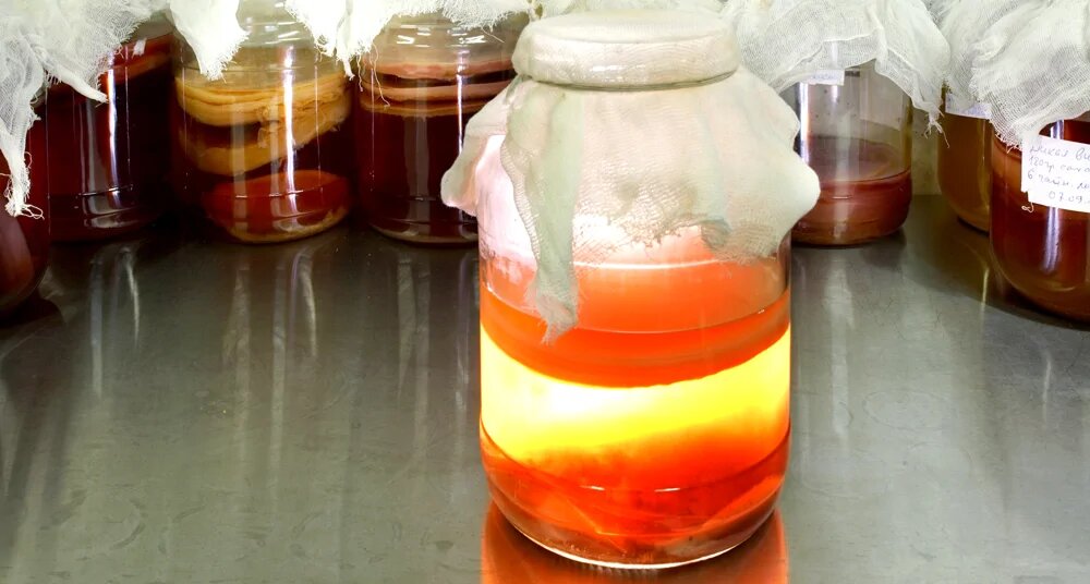 Часть грибов, не использующихся в производстве, отдыхает в специальных бочках с чайным настоем, требуя внимания и заботы. Это важный процесс, так как интерес к комбуче существует в России более 150 лет — к примеру, ее популярность возросла после сообщений о том, что сибиряки настой из гриба использовали для приготовления кваса.