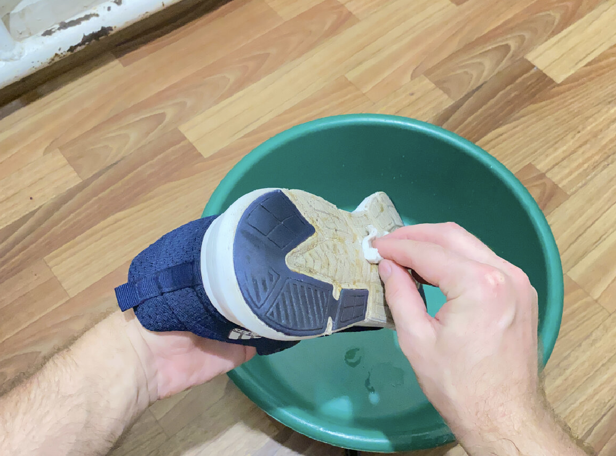 Также стоит попробовать другой подход. Налейте муравьиный спирт в небольшую ёмкость, опустите в него зубную щетку и аккуратно очистите подошву. Зубная щетка позволит дотянуться до труднодоступных мест и лучше справится с застарелыми загрязнениями.