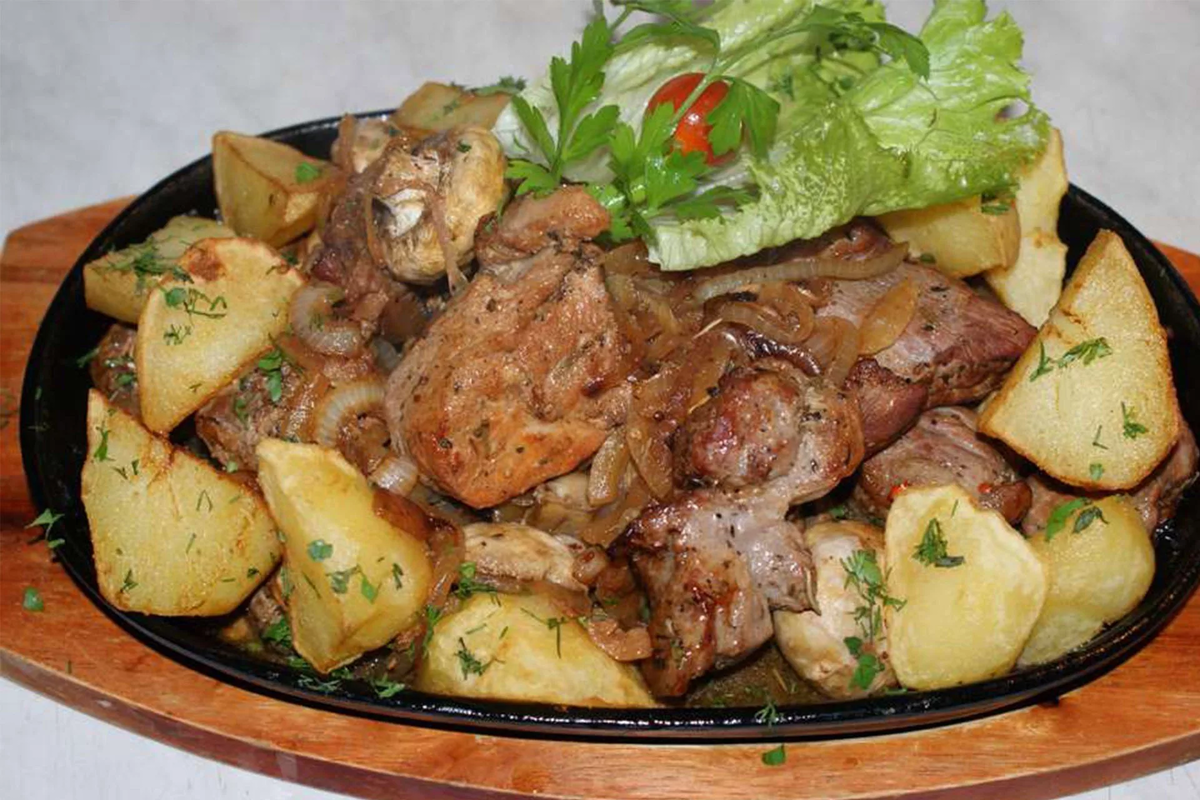Для начала нарезать говядину на средние кусочки и замариновать её с солью и перцем. Затем очистите и нарежьте картофель, лук и грибы. На сковороде можно оперативно обжарить мясо и овощи, чтобы они приобрели золотистую корочку и дополнительный вкус.
