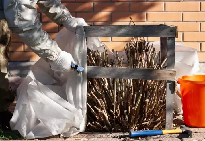- Взрослые кусты: Ветки собираются вместе, связываются и обматываются мешковиной. Для создания каркаса можно использовать сетку, а пространство между ней и мешковиной заполняется листьями. Сверху конструкцию накрывают пленкой.
