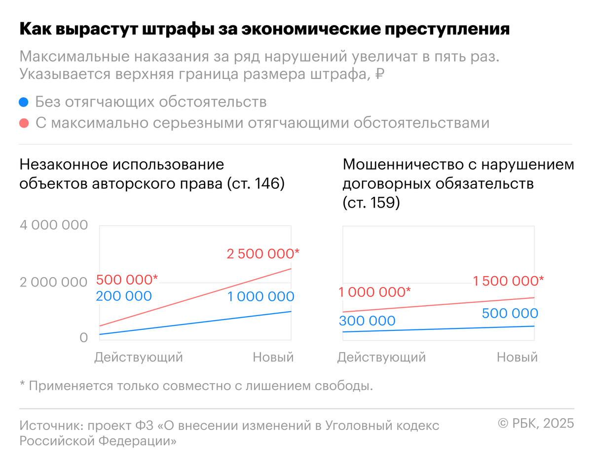 Отметим, что максимальные штрафы за незаконное использование авторских прав вырастут с 200 тыс. до 1 млн рублей за преступления крупного размера. В случае особо крупного нарушения с участием служебных лиц или группы лиц штраф может достичь 2,5 млн рублей.