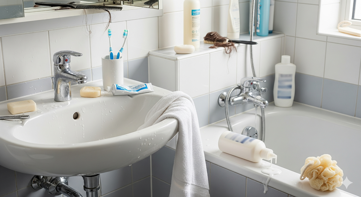 Постоянное использование раковины для умывания и мытья рук, а также применение различных косметических и гигиенических средств приводит к тому, что вещи скапливаются на полках и краях раковины, создавая визуальный хаос.