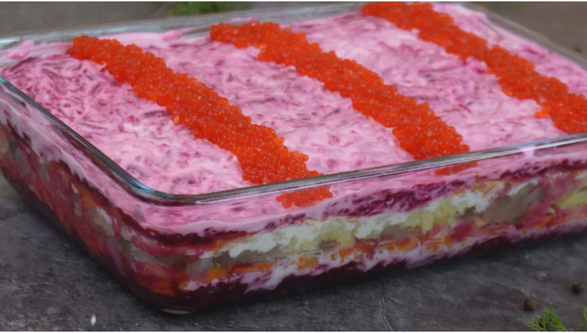 - Седьмой слой: оставшаяся свекла, завершаем майонезом.