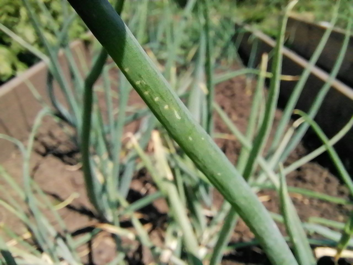 Сквозь здоровое зеленое перо могут пронзать белые червячки, оставляя за собой желтые пятна и продолговатые следы. Этот незваный гость проникает внутрь, где оставляет экскременты, делая продукт непригодным для употребления. Луковой скрытнохоботник откладывает яйца в перо, и всего через несколько дней личинки начинают свое разрушительное «пиршество».