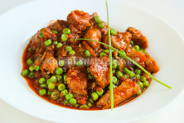 На следующем этапе вводят в смесь томатную пасту, соль, перец, кориандр и натертый чеснок. Все тщательно перемешивают и заливают горячей водой, чтобы частично покрыть свинину. Если используется консервированный горошек, то в это время добавляют и рассол.