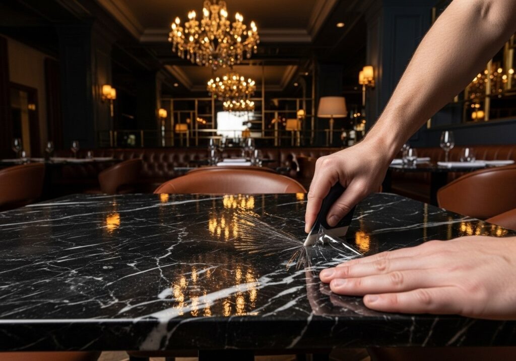 - Защитная пленка: Современные полимерные пленки представляют собой эффективное решение, сохраняя внешний вид и тактильные свойства природного камня. Подобные пленки способны выдерживать высокие температуры и механические воздействия, продляя срок службы столешниц до 7 лет.