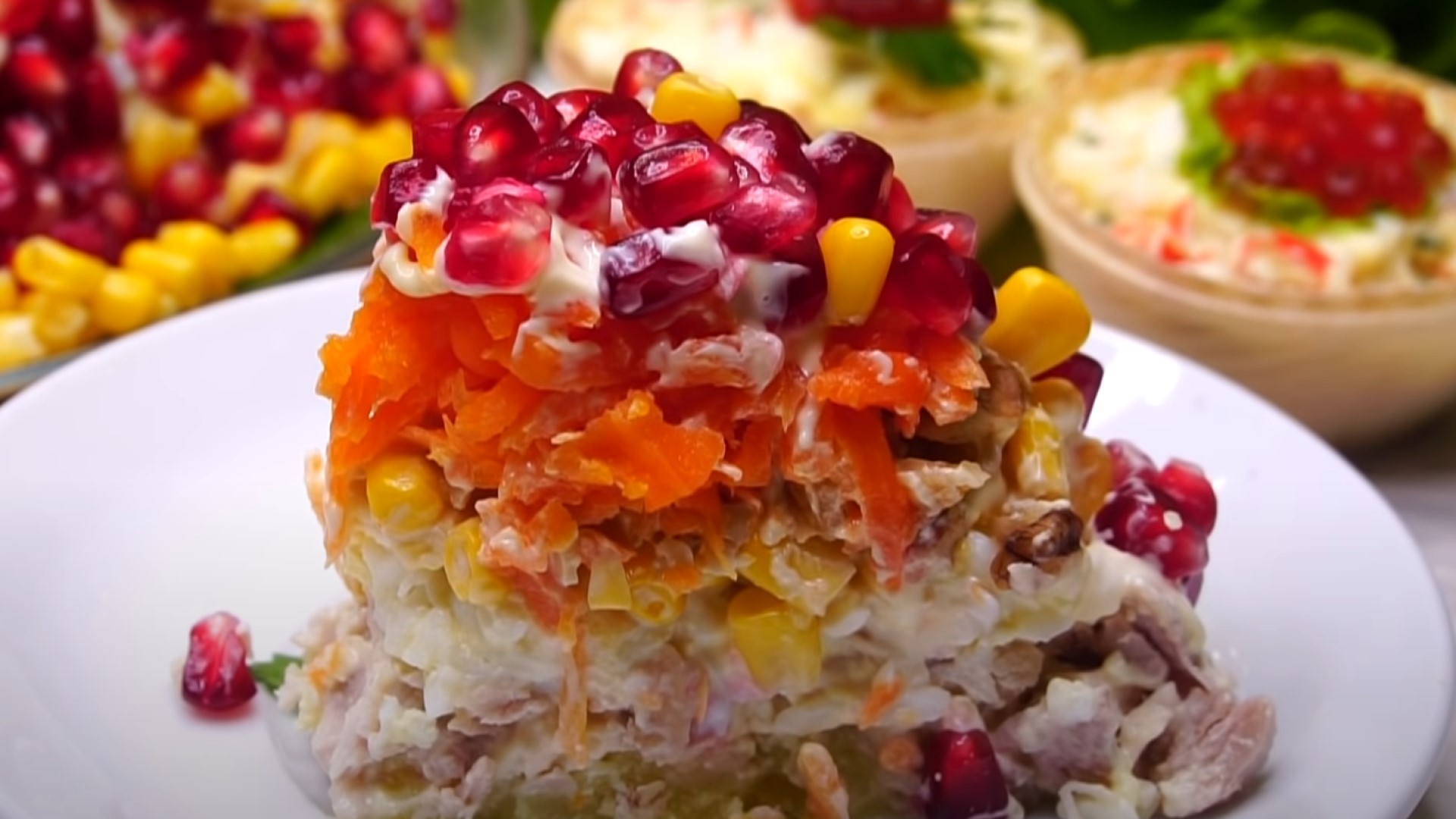 Посыпаем салат измельченным грецким орехом, кукурузой и зернами граната. По желанию украшаем зеленью.