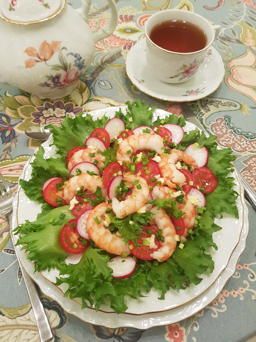 На сервировочную тарелку уложите промытые листья салата, в центре аккуратно разместите кусочки омлета, сверху распределите очищенные креветки, нарезанные помидоры и редис. Завершите оформление посыпкой из рубленого зеленого лука и добавлением сока свежевыжатого апельсина. Этот легкий и красочный салат станет не только украшением стола, но и настоящим кулинарным шедевром.