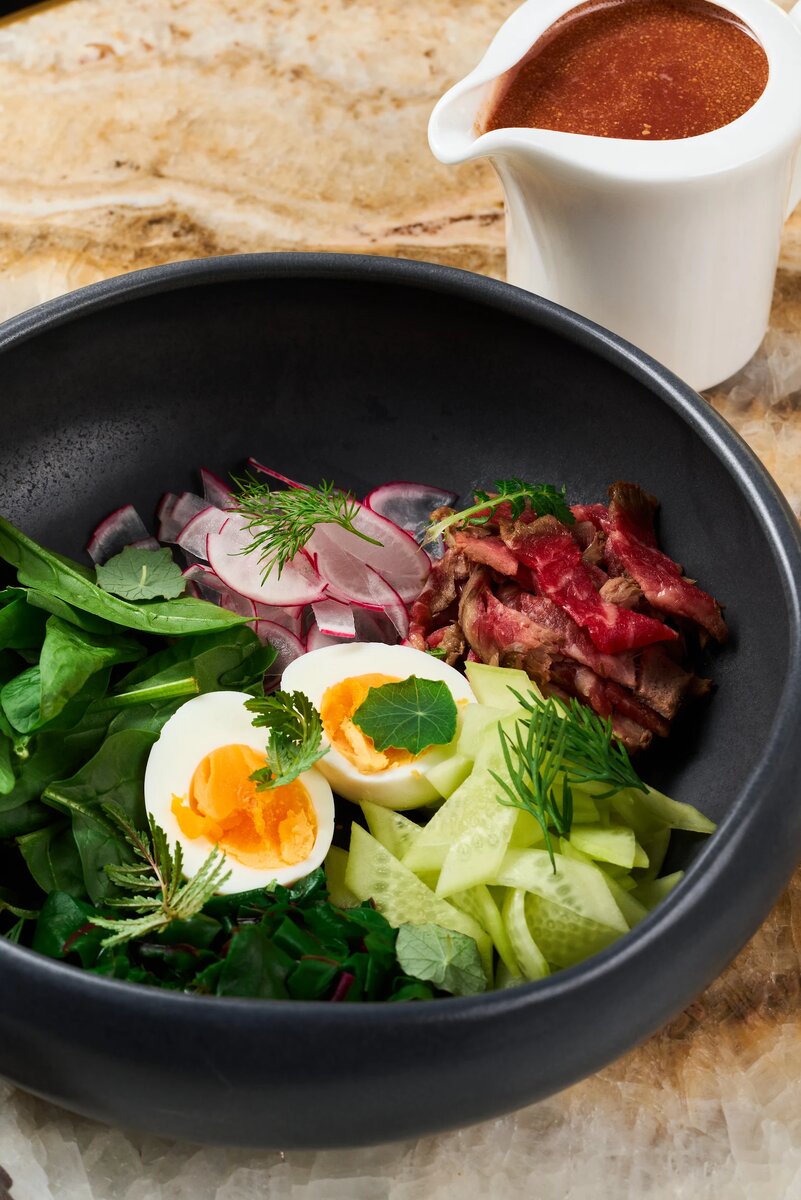 - Мелко нарежьте шпинат, отваренное яйцо, ростбиф, редис и огурец.