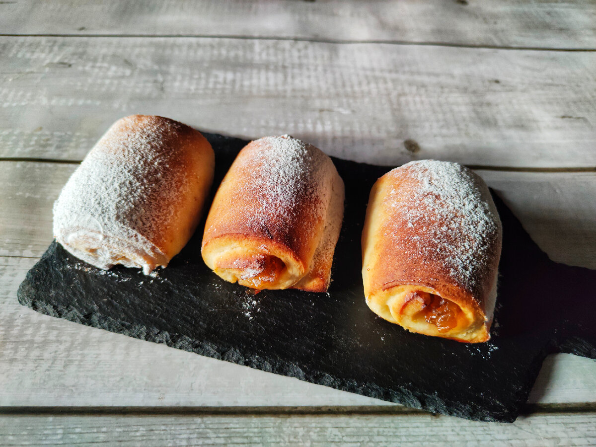 5. На один край каждого прямоугольника выложите немного повидла и аккуратно скатайте в трубочку, не принуждая к краям. Переложите сформированные булочки на противень швом вниз, слегка придавливая их, чтобы они не катались по поверхности.