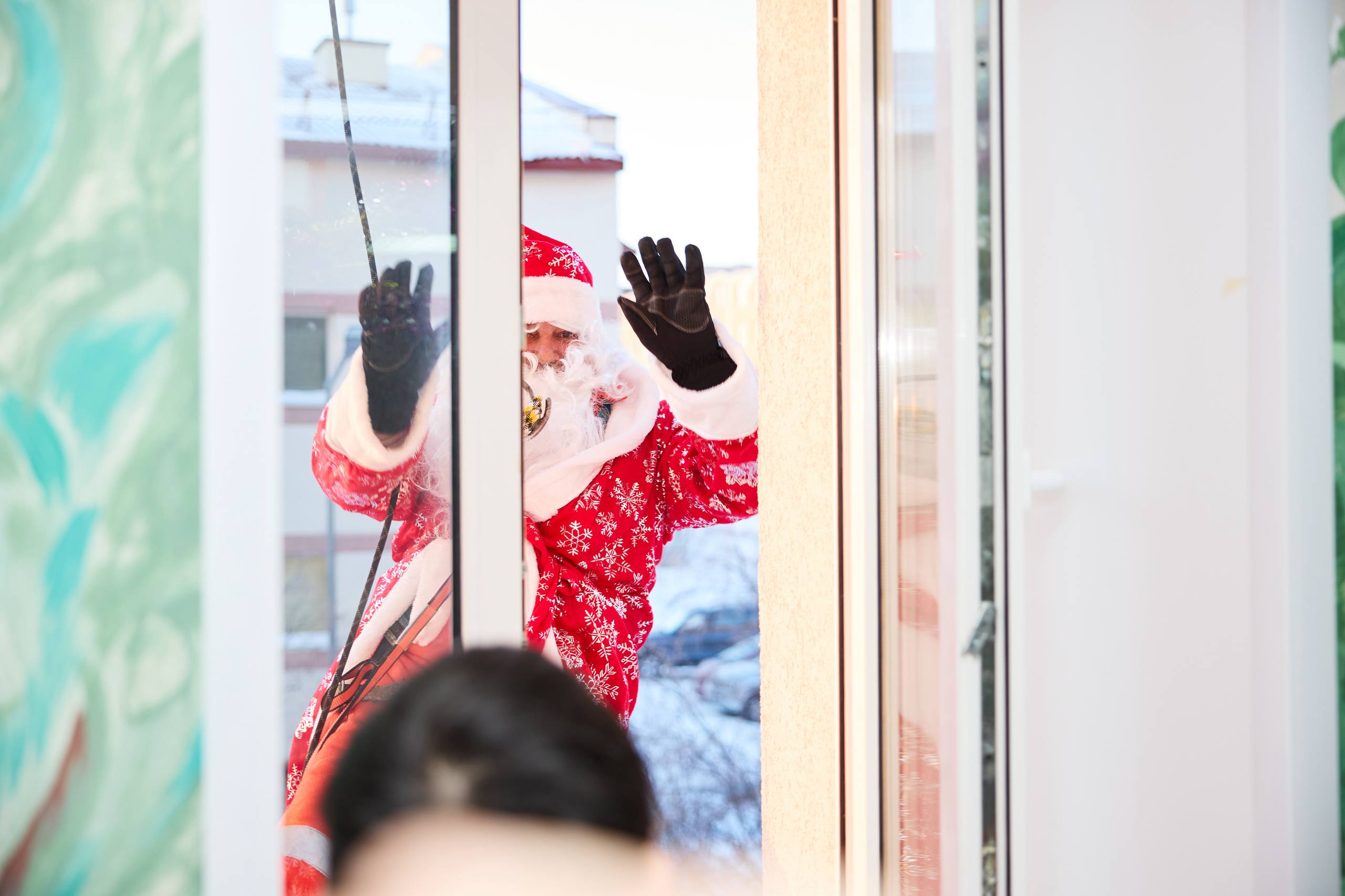 Сотрудник Главного управления МЧС России по Чукотскому автономному округу в костюме Деда Мороза спустился с крыши здания к окнам детского отделения и совместно с волонтёрами медиками поздравил детей с предстоящими новогодними праздниками, вручил им сладкие подарки и тёплые слова поддержки.