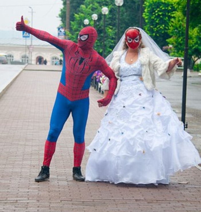 - Супергерои на свадьбе. Этот жених, явно заядлый фанат Человека-паука, выбрал костюм, напоминающий о его любимом персонаже. Невеста не отстала и решила поддержать его с оригинальной маской. Это креативное решение добавило азарта на церемонию.