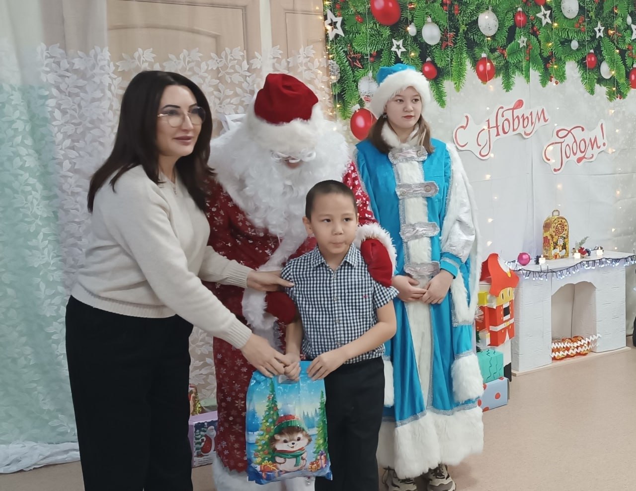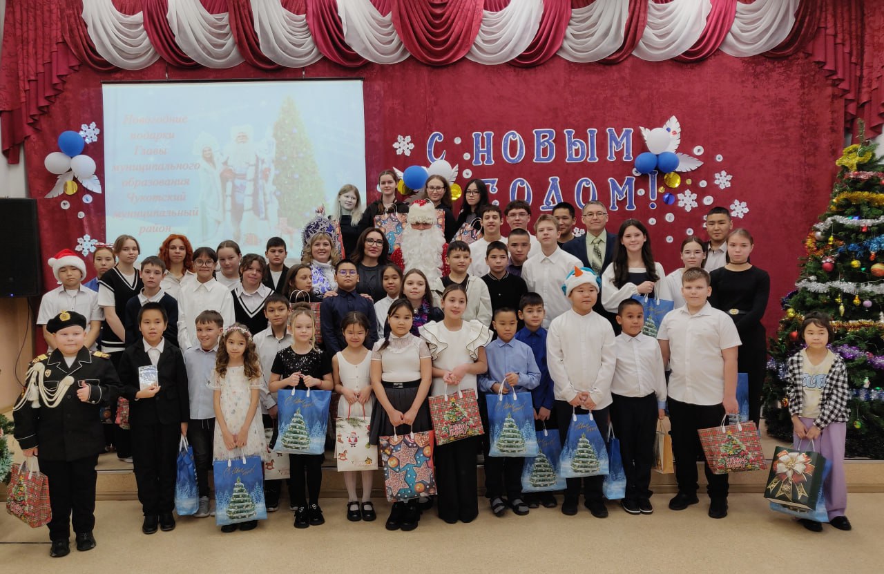В канун Нового года Глава Чукотского района Лариса Юрочко вместе с Дедом Морозом и Снегурочкой на школьной линейке вручила подарки детям Центра образования с. Лаврентия, отличившимся в учебе и общественной жизни школы и района, а также дети участников специальной военной операции.