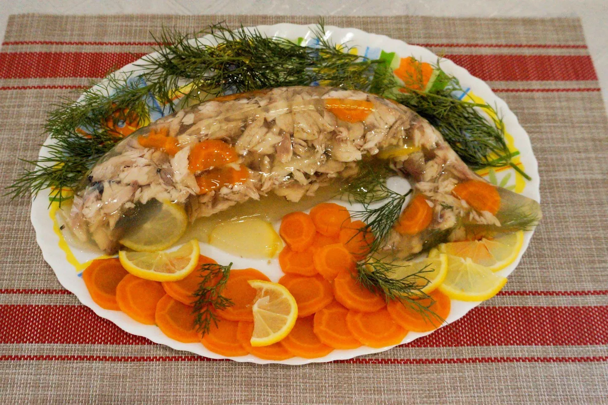 Подготовка ингредиентов: Убедитесь, что у вас есть голова, хвост и стейк сазана. Самые вкусные части рыбы — это, безусловно, голова. Не забудьте удалить жабры.Приготовление бульона: Очистите и промойте морковь и лук. Положите их в кастрюлю, залейте 1,5 л холодной воды. Добавьте лавровый лист и душистый перец. Варите на среднем огне около 10 минут после закипания.Варка рыбы: Добавьте куски сазана в бульон, посолите по вкусу. Уменьшите огонь до минимального и помните, что по мере варки образуется пена, которую следует удалять. Варите сазана 30 минут, а затем уберите лавровый лист.Сборка блюда: Остудите рыбу, удалите косточки и нарежьте ее на кусочки. Морковь нарежьте тонкими кругами, лимон — дольками, укроп промойте и просушите. В форму для заливного выложите рыбу, морковь, лимон и укроп.Процеживание бульона: Процедите бульон через несколько слоев марли для большей прозрачности. Аккуратно, с помощью столовой ложки, заполните форму бульоном и оставьте в холодильнике для застывания — это займет около 4 часов.Полученное заливное порадует не только вкусом, но и привлекательностью. Это изысканное блюдо идеально подойдёт для торжественного случая или семейного праздника.