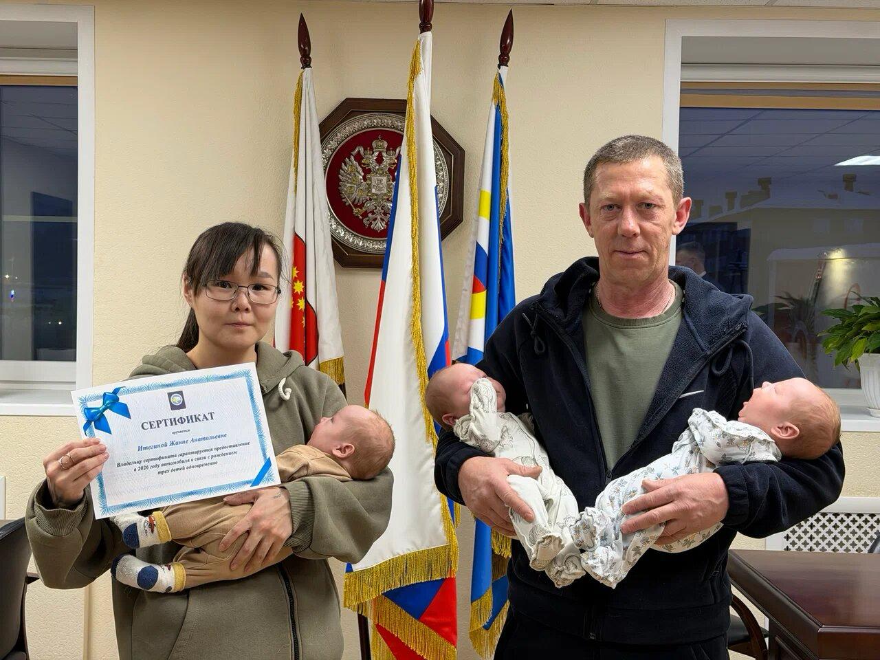 Семье с тройняшками на Чукотке вручили сертификат на семейный автомобиль