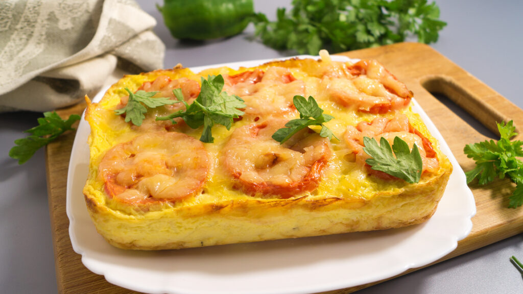 Готовую запеканку рекомендуется подавать слегка остывшей, отлично сочетается со сметанным соусом или соусом на основе греческого йогурта с добавлением свежей зелени укропа или петрушки.