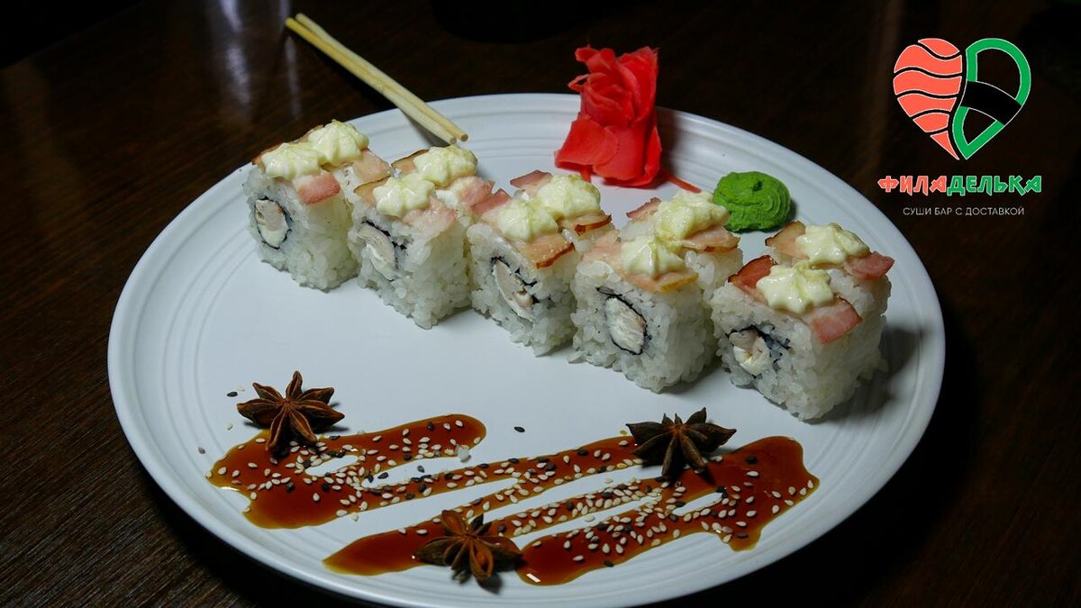 Этот ролл главный фаворит для тех, кто ценит новизну и классическую японскую кухню. Внутри него вас ждёт нежный сливочный сыр, который гармонично обнимает копчёную курицу. А сверху златой корочкой скрывается хрустящий бекон и аппетитный шапочка белого соуса — настоящее гастрономическое наслаждение!