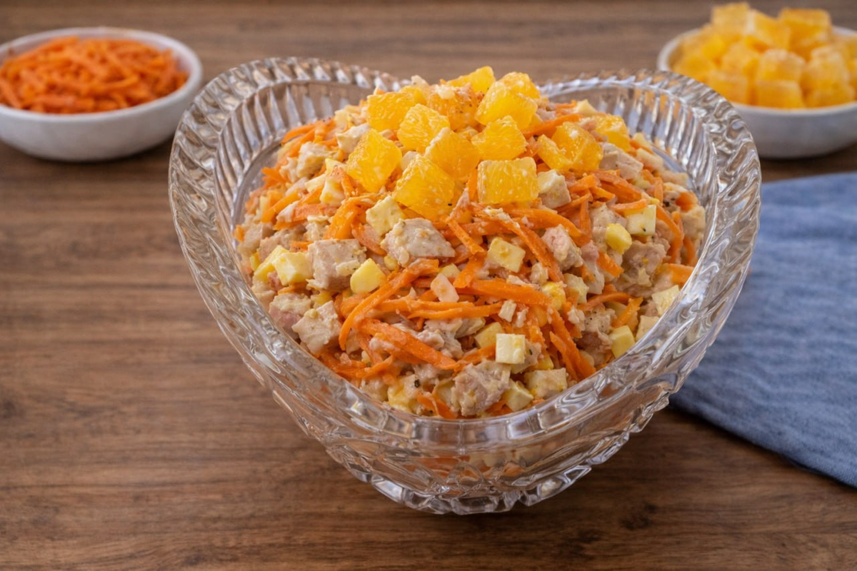 Когда за окном сменяется сезон бытовой суеты, простое блюдо встает на защиту воскресного настроения. В таком салате всё на своих местах: сочная основа из копчёной курицы, характерная морковь по-корейски, кремовый сыр и мягкие яйца создают спокойную полноту вкуса, а апельсин добавляет лёгкость, чтобы радость от меню не утомляла.