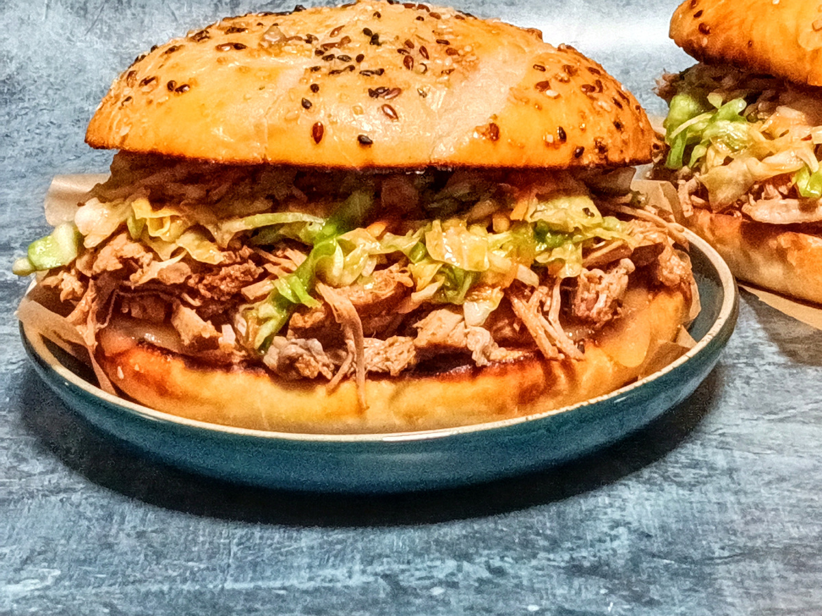 Свинина разбирается на волокна, заливается процеженным бульоном и оставляется на 20 минут. Сэндвич собирается: нижняя булочка, два кусочка сыра, рваная свинина, красный коулслоу и верхняя булочка. Не забудьте поджарить булочки для хрустящей корочки!