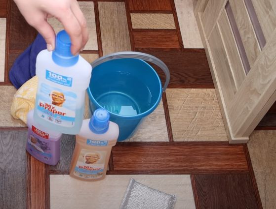 - Пол: для пола достаточно развести 2 колпачка на ведро воды. Для трудоемких мест можно использовать концентрат прямо на губке.