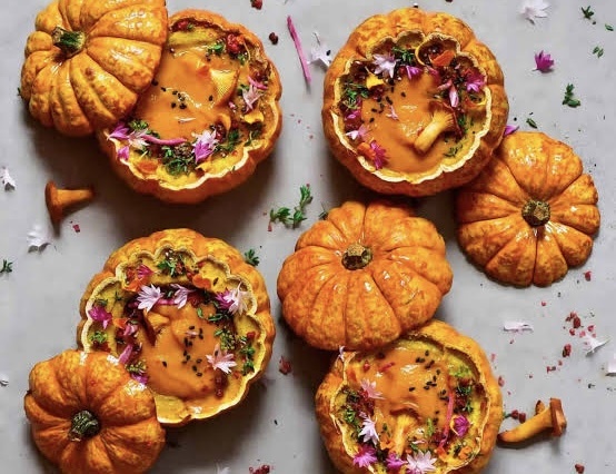 - Грибной суп с полентой: Обжаренные лесные грибы с полентой, залитые бульоном, запеченные в тыкве.