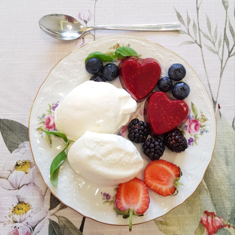 Подача десерта может быть разнообразной: разложите на тарелках мороженое и застывшее желе, дополните свежими ягодами — клубникой, ежевикой и голубикой — и украсьте зелеными листиками базилика.