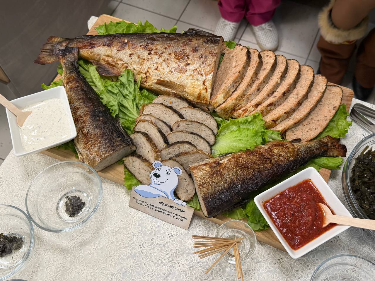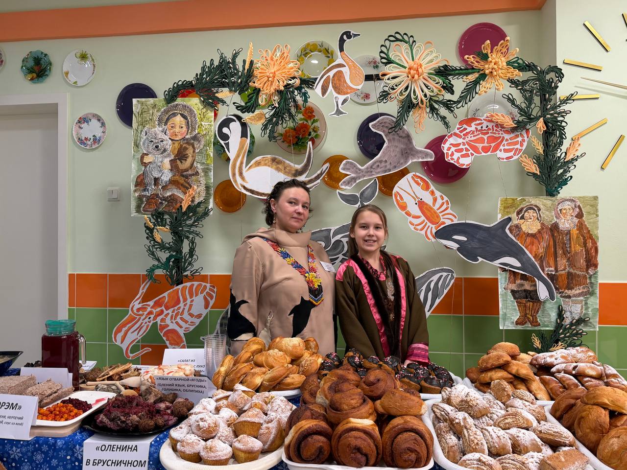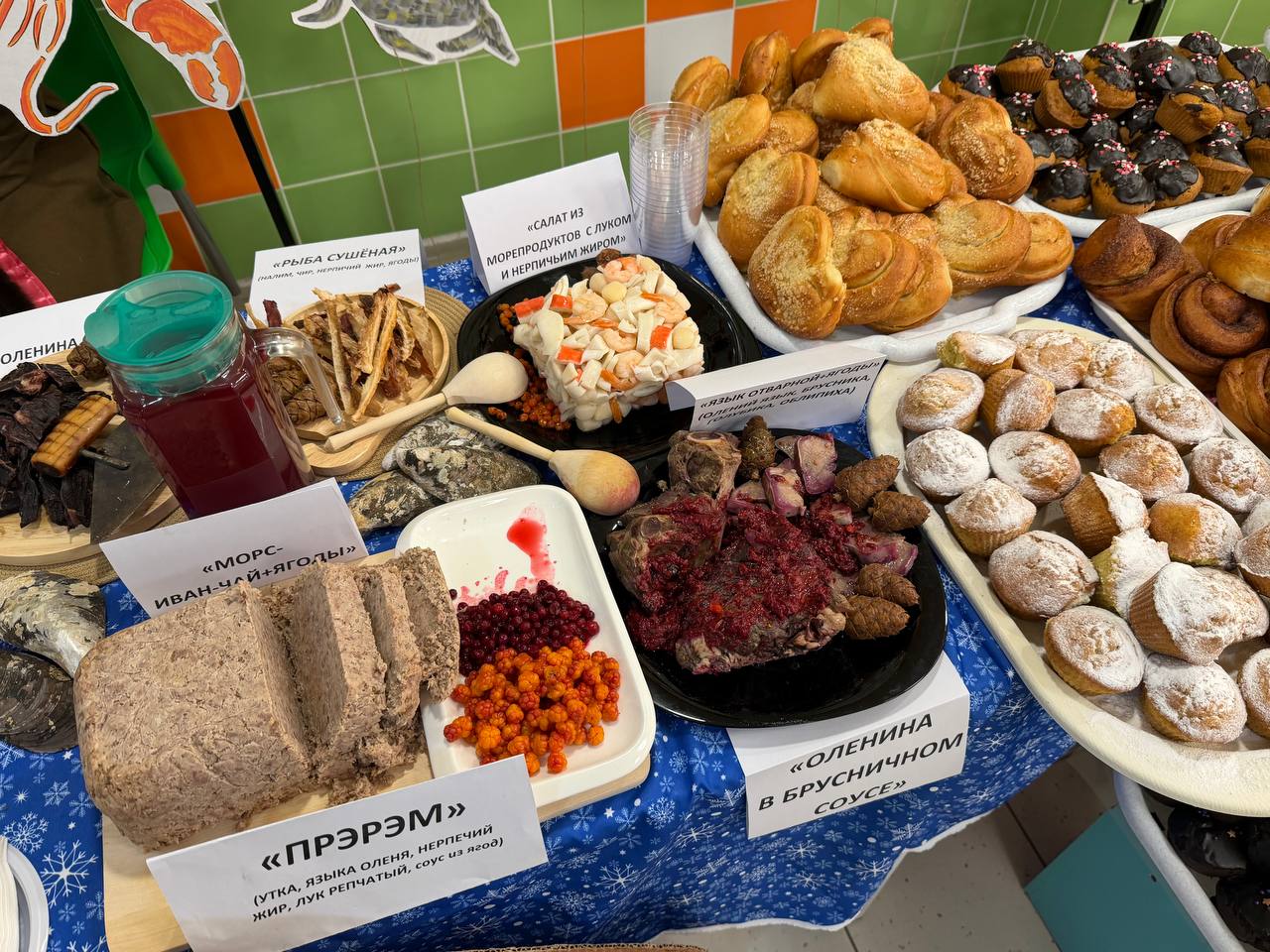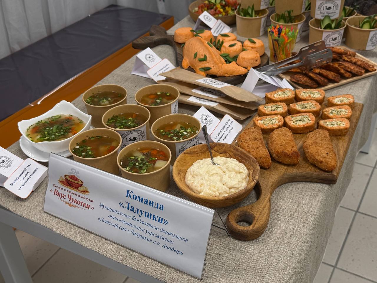 На столах участников были представлены такие блюда как: чир запеченный, китовое варенное мясо, салат из оленины «Тундра на тарелке», морс из морошки, суп «Чукотский следопыт» и много другое.