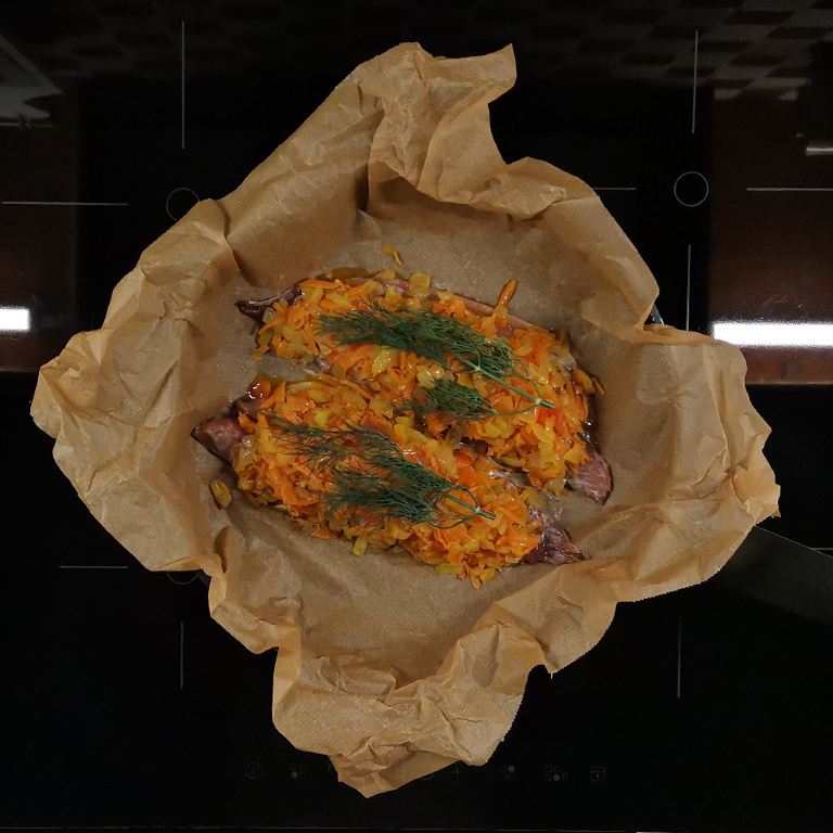 Теперь самое интересное: возьмите качественную пекарскую бумагу и выложите на нее скумбрию шкуркой вниз, а сверху поместите обжаренные овощи. Накройте сковороду крышкой и ставьте на средний огонь на 15 минут. Этот метод позволяет сохранить все соки и ароматы в блюде, а также устранить неприятные запахи.