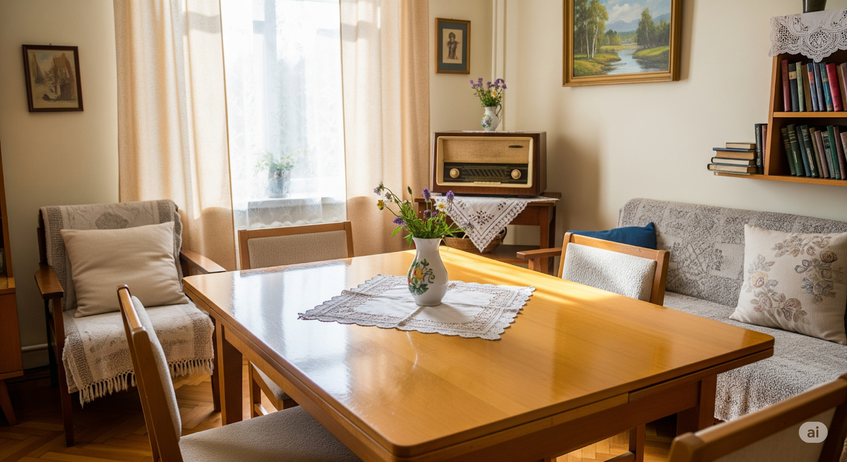 Стандартная советская квартира — это зачастую небольшие комнаты, где жили несколько поколений. Постоянно открытая форточка, свежевымытые полы и аккуратно расставленная мебель — все это было неотъемлемой частью привычного уклада. Дисциплинированный подход к уборке и уважение к каждому предмету создавали ощущение опрятности.