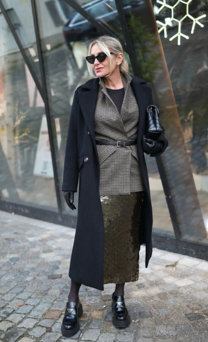 1. Стальной повседневный look: блестящая юбка до лодыжки в коричнево-зеленых тонах, черная футболка и жакет в серо-черную клетку, акцентированный поясом. Этот набор прекрасно сочетает контрастные фактуры и создает гармоничный образ.