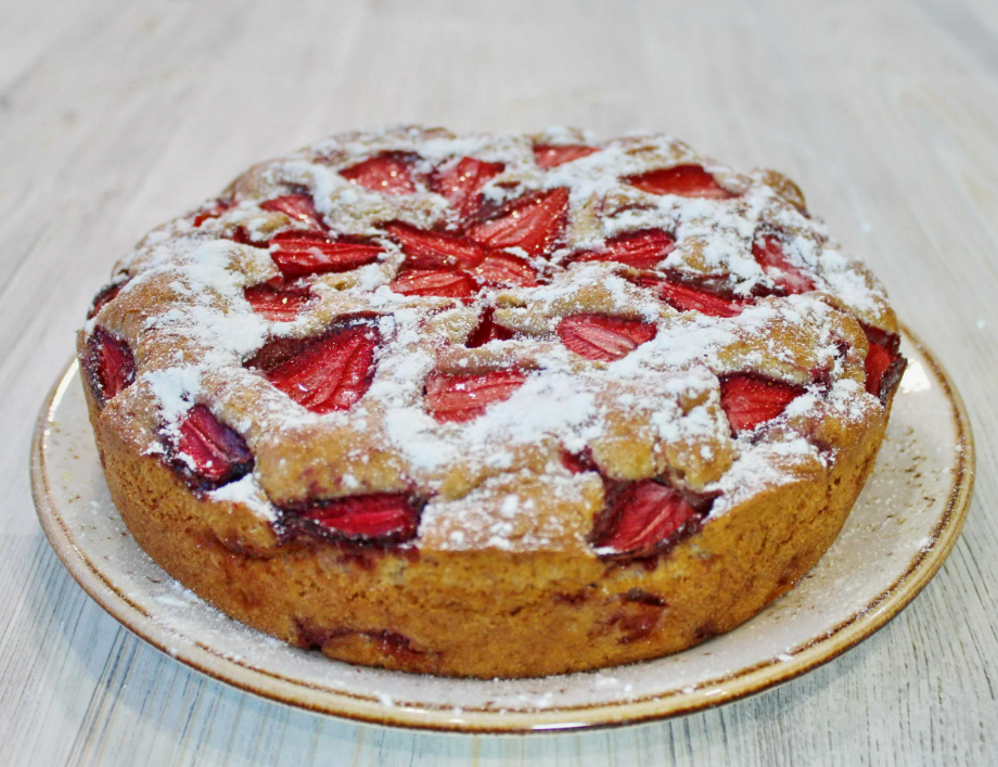 5. Переложите готовую массу в заранее смазанную маслом форму и украсьте сверху оставшимися ягодами клубники.