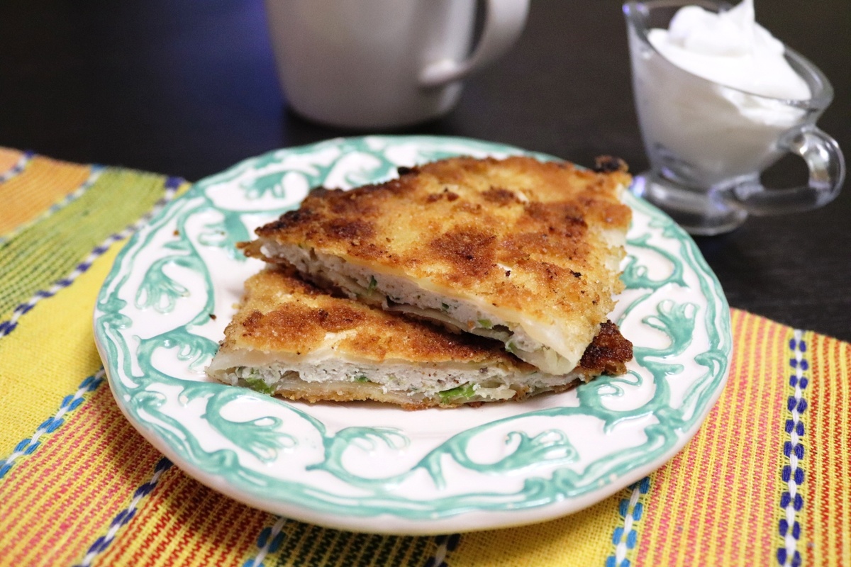 Теперь пора собирать чебуреки. На один капустный лист выкладывается порция фарша, которую нужно аккуратно прижать второй половиной листа. Получившиеся чебуреки обваливаются в крахмале, затем в взбитом яйце и наконец в панировочных сухарях, что даст им ту самую хрустящую корочку.