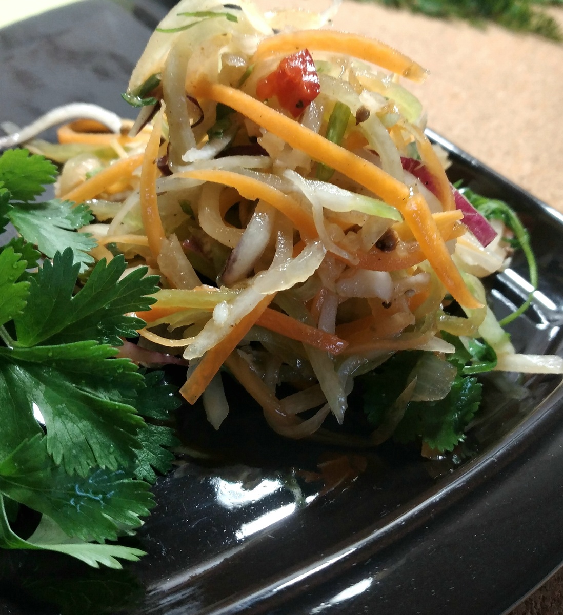 Закуска тщательно перемешивается и оставляется на 2 часа, чтобы пропитаться вкусами.
