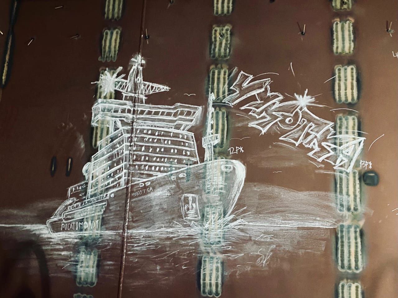 Такое граффити скрывает одна из переборок строящегося серийного универсального атомного ледокола "Чукотка". Мел, металл, вдохновение строителя - и рисунок готов.