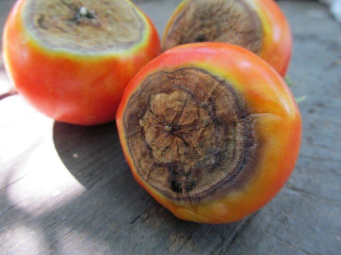 На плодовидной части помидоров вы можете увидеть коричневые, а затем черные пятна, которые со временем загнивают. Интересно, что эти изменения связаны с нарушением формирования и работы проводящих сосудов в тканях.