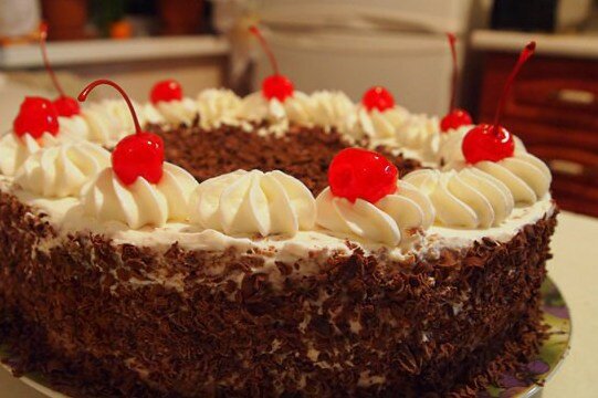 Первый корж полить вишневым сиропом, затем равномерно нанести шоколадный крем. На него положить второй корж, также пропитать сиропом. Взбить сливки и покрыть ими торт, украшая вишнями и шоколадом по желанию. Сделать красивые рюмки из сливок с помощью кондитерского мешка. Торт лучше подавать охладив, чтобы слои лучше держали форму.