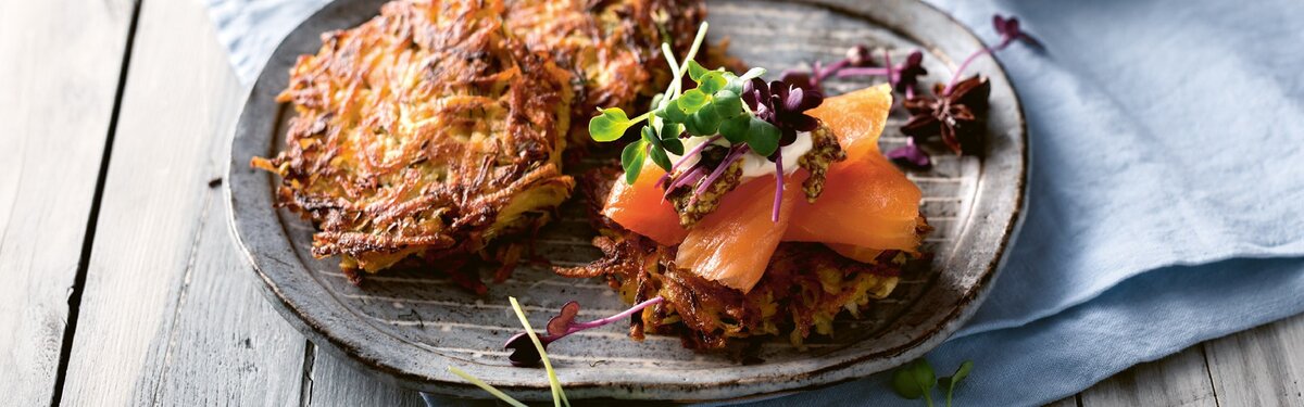 Подавая на стол, украсить рёшти копченым лососем, сметаной, сладкой горчицей и нежным кресс-салатом.