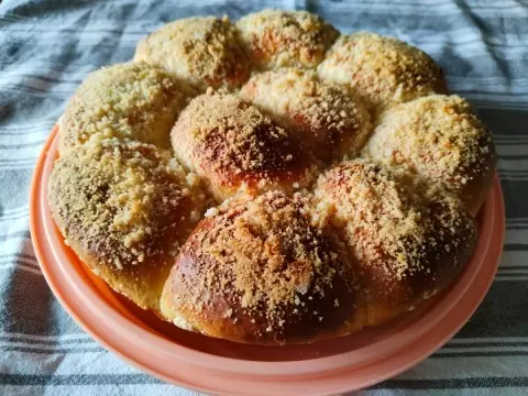 По истечении часа тесто обминаем, делим на равные части, формируем круглые лепешки и выкладываем начинку. Склеиваем края и выкладываем заготовки в смазанную форму. Сверху смазываем теплым молоком, посыпаем сахарной крошкой и оставляем на 20 минут для подъема при комнатной температуре.