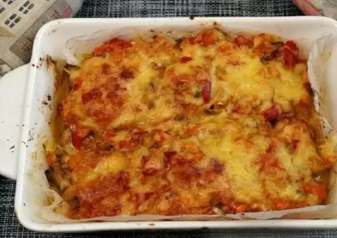 Филе укладывается в форму для запекания, смазанную растительным маслом, и поливается лимонным соком. Далее готовятся овощи: лук, перец и морковь очищаются и нарезаются, шампиньоны также нарезаются на небольшие кусочки. Все ингредиенты обжариваются на сковороде с разогретым растительным маслом около 5-7 минут на среднем огне.